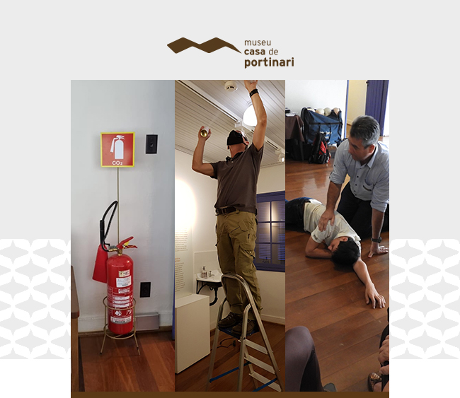 Os extintores de incêndio, de diferentes classes, são rigorosamente inspecionados. Além do mapa de localização dos equipamentos, o Plano de Emergência e Contingência considera as características específicas do museu e do acervo.